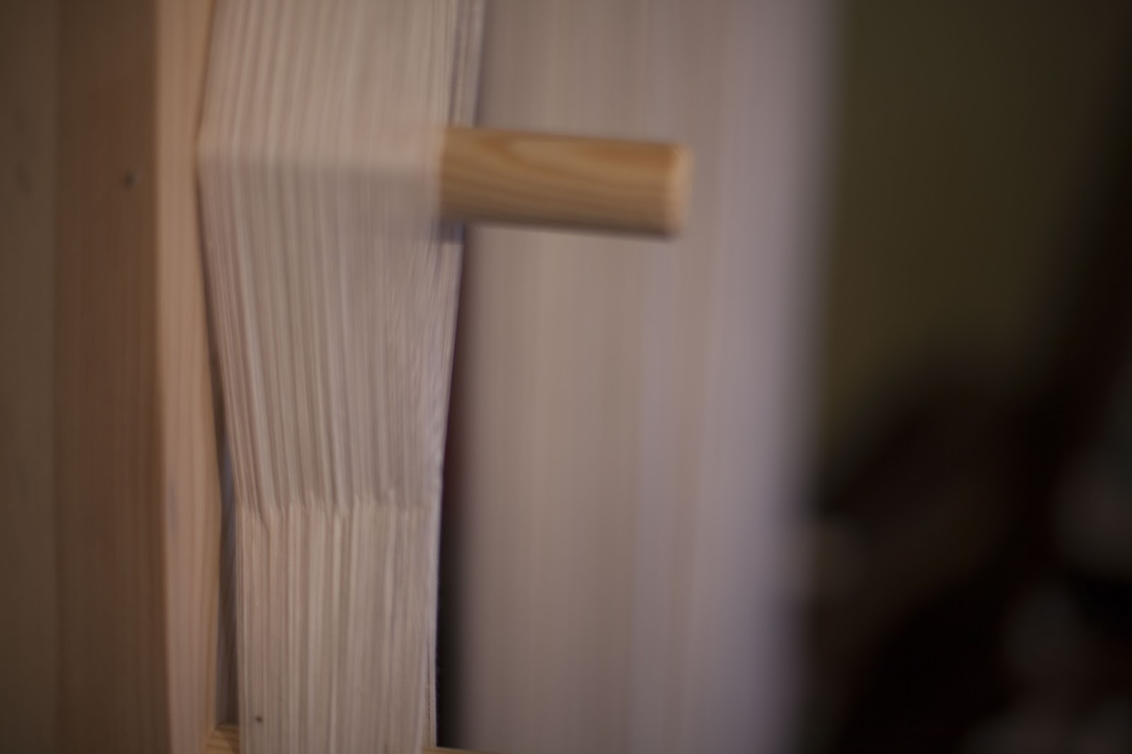 Pierwszy dzień upłynął na osnuwaniu, wielo-wielogodzinnym. Czy te kobiety kiedyś miały masażystów załączonych w pakiecie do krosien?